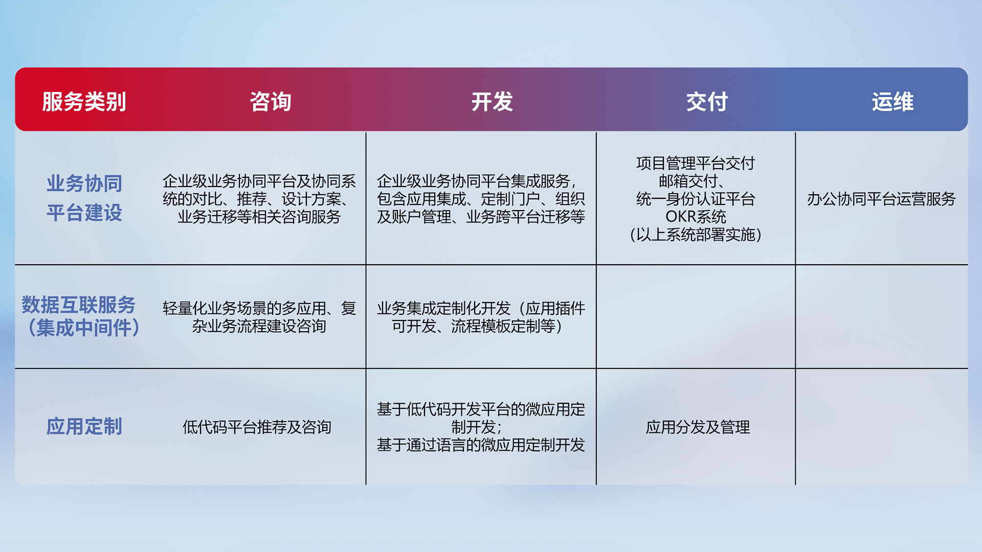 针对钉钉、、企微、、IDaas等平台级产品提供产品的规划、、方案、、、、交付、、、定制化开发等服务,,实现如统一协同办公、、智能客户服务、、、、混合会议管理、、、智能数据查询、、、等业务场景,,,实现数字化转型。。。。