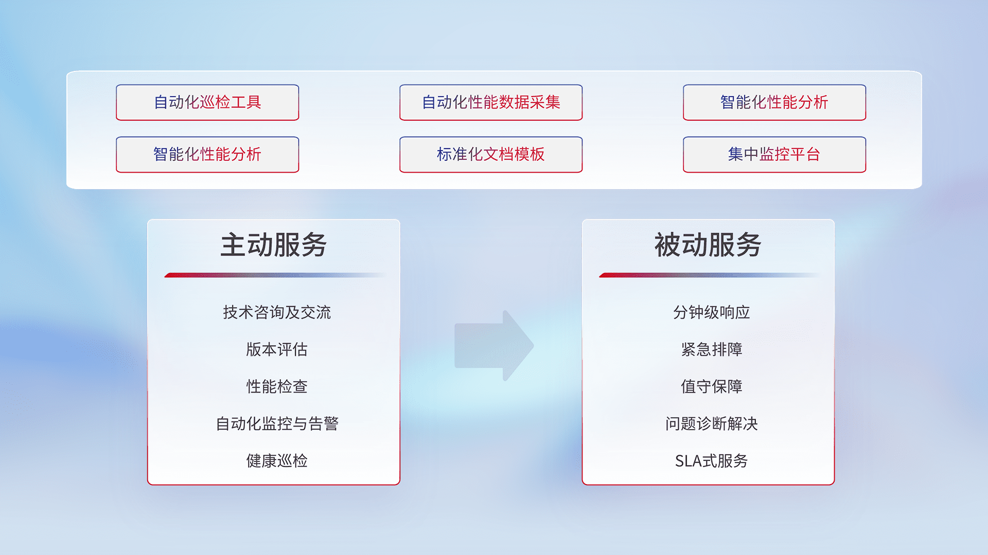 智能化工具和标准化文档,,,,保障服务质量,,提供主动服务(包含技术咨询、、、版本评估、、性能检查、、自动化监控与告警、、健康巡检)和被动服务包含(分钟级响应、、、紧急排障、、值守保障、、、、问题诊断解决、、、、SLA服务)。。。。